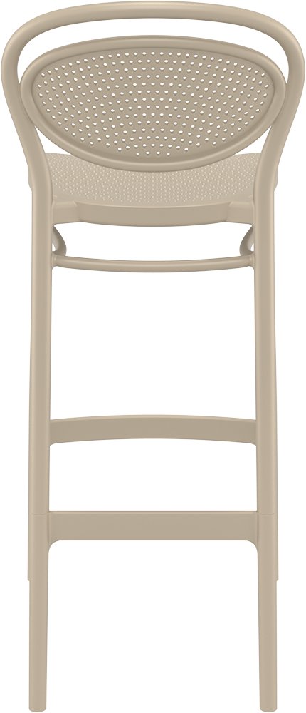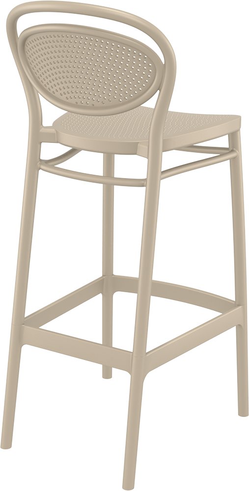 Stijlvol en praktisch: De rugleuning en zitting van de Marcel Bar 75 Kruk zijn voorzien van een eigentijdse perforatie, wat niet alleen het design versterkt maar ook het comfort verhoogt.
