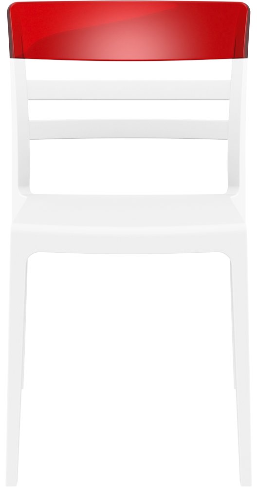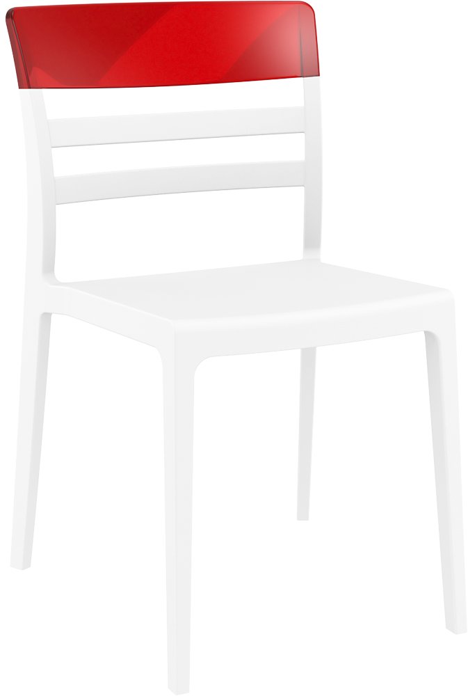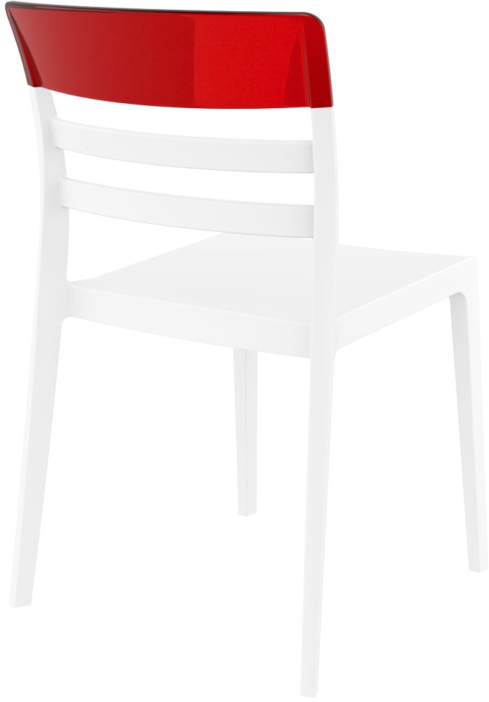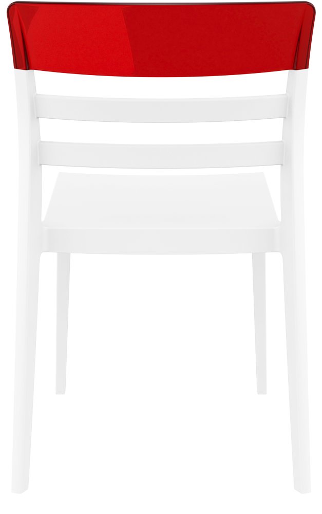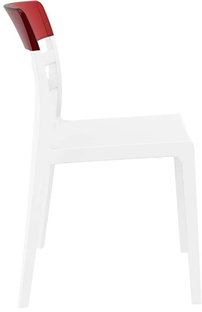 De Moon stoel in wit met een transparante roodkleurige rugleuning voegt een vleugje eigentijdse charme toe aan elke setting. Hij is praktisch stapelbaar voor ruimtebesparende opslag en is bestand tegen verschillende weersomstandigheden, wat hem ideaal maakt voor gebruik in de open lucht.