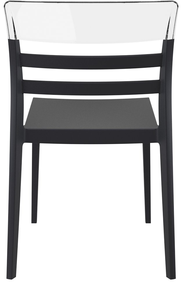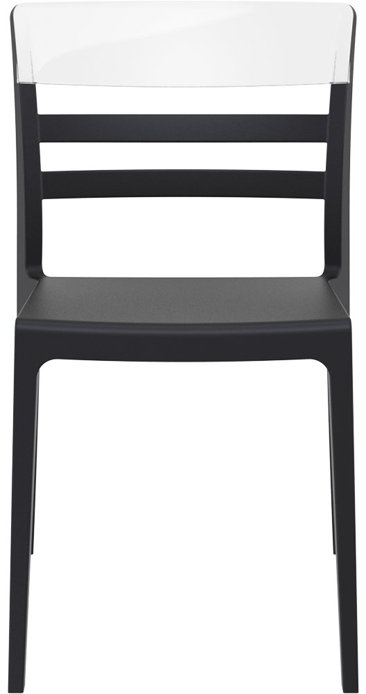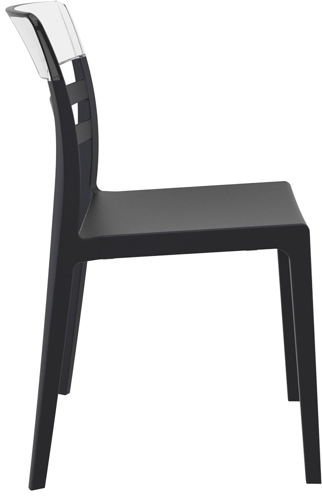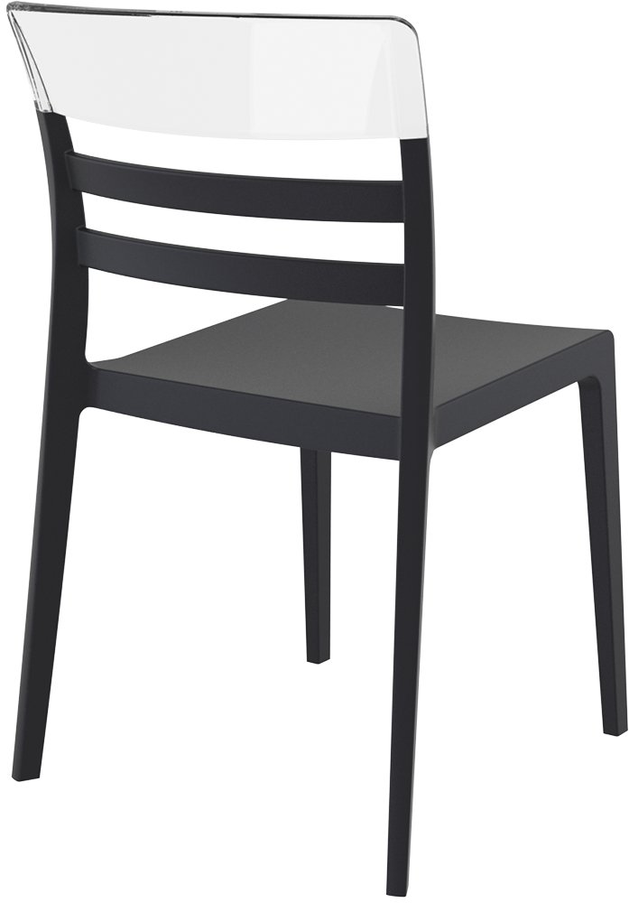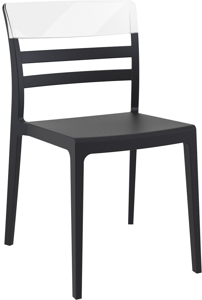 De Moon stoel in zwart met een transparante afwerking aan de bovenkant van de rugleuning voegt een vleugje eigentijdse elegantie toe aan elke setting. Hij is praktisch stapelbaar voor gemakkelijke opslag en kan moeiteloos alle weersomstandigheden aan, wat hem ideaal maakt voor gebruik buitenshuis.