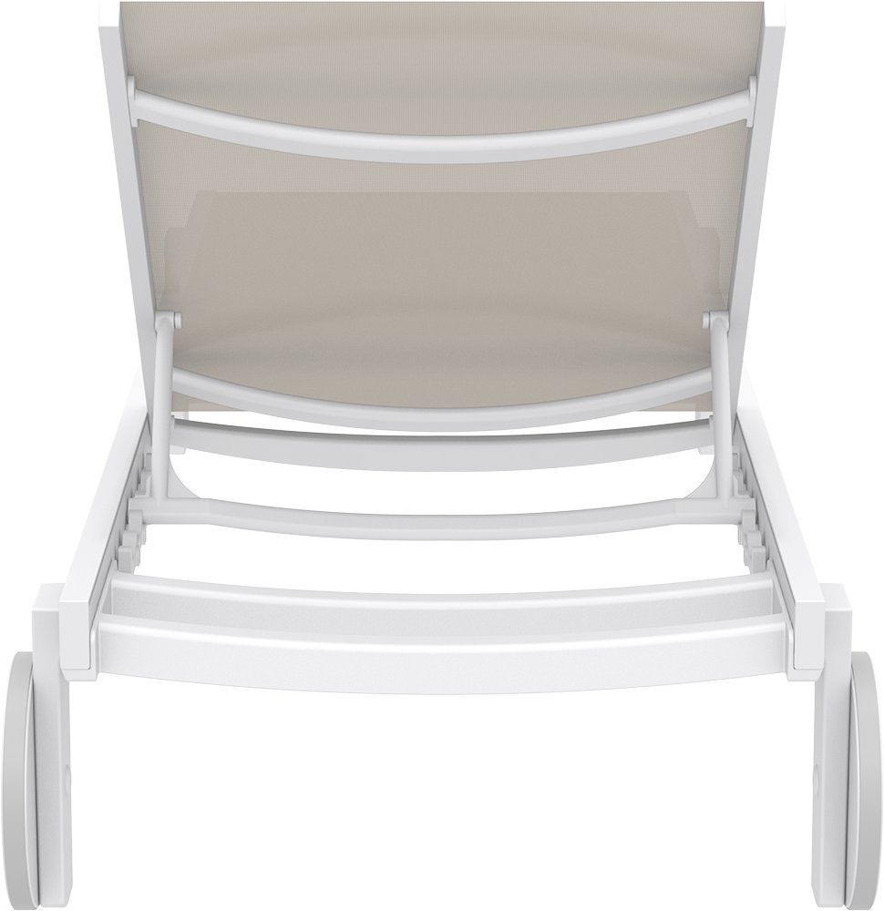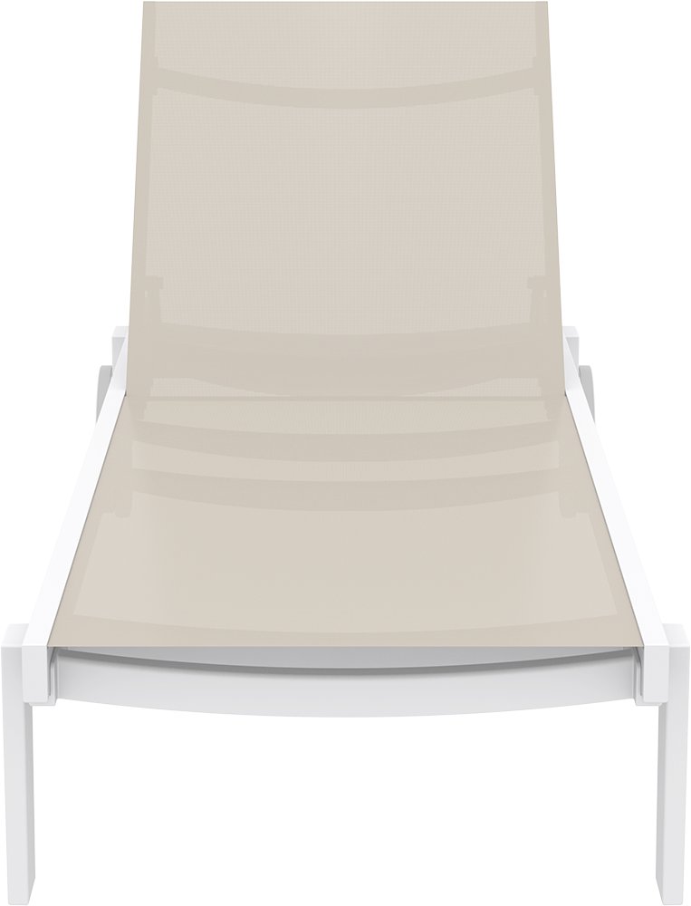 Deze luxe ligstoel combineert hars versterkt met glasvezel met een gelakt aluminium frame, wat zorgt voor een lichte maar robuuste constructie. De ademende, vervangbare stof in taupe zorgt voor een koel en comfortabel gevoel, terwijl het witte frame een frisse en verfijnde uitstraling biedt.