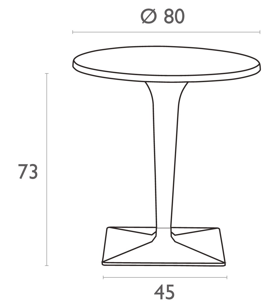 Het blad is vervaardigd van weerbestendig Werzalit, perfect geschikt voor gebruik in diverse weersomstandigheden. De tafel staat op een heldere, transparante polycarbonaat poot en een stevige, geschilderde aluminium basis, die niet alleen stabiliteit biedt maar ook een eigentijdse uitstraling geeft.